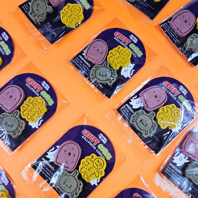 Celebrate Halloween with a little spooky sweetness! Our Creepy Cuties are all-natural, flourless cookies crafted with goat milk, sweet potato, purple yam, pumpkin, activated charcoal, and honey, gently baked for pets with sensitive tummies.