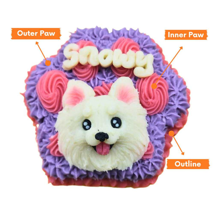 One of our best-sellers, this small paw cake can fit one portrait and a short dedication. Choose from any of our flavors, and select a frosting color that suits the party's theme.