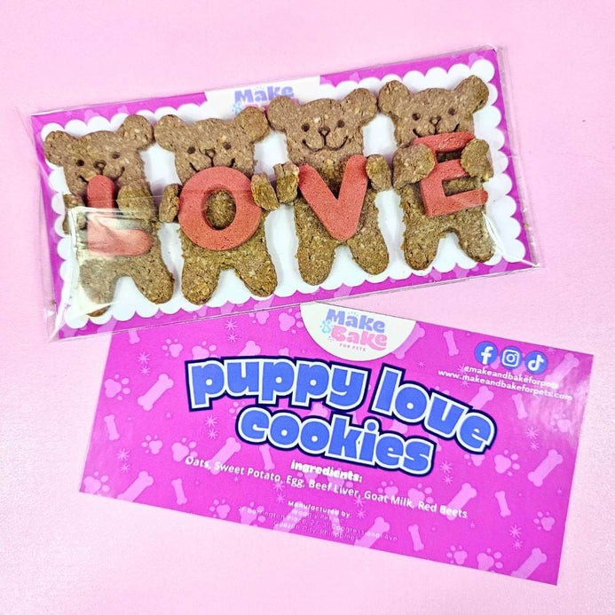 Our Puppy Love Cookies are a Valentine favorite—adorable teddy-shaped cookies holding the word LOVE, made with simple, dog-friendly ingredients and finished to be as cute as they are irresistible.